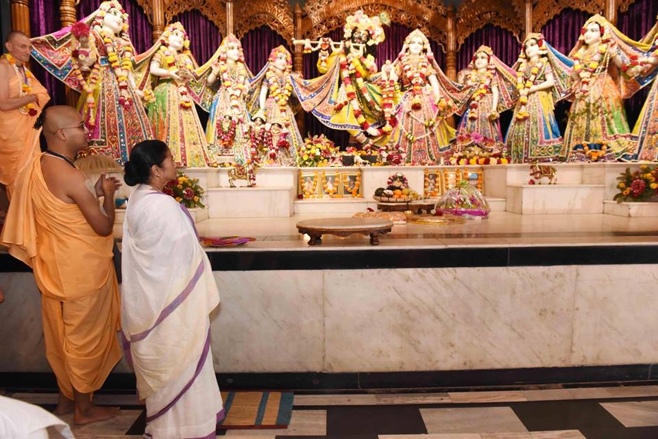 Она приземлилась на вертолете на территории ИСККОН за две минуты до назначенного времени и сразу посетила храм. Еще с воздуха она осмотрела огромный храм Ведического планетария, открытие которого назначено на 2022 год. Мамата Банерджи в сопровождении других официальных лиц штата оказала почтение Господу перед алтарем в храме и предложила пуджу Радхе-Мадхаве, Нрисимхадеву и Панчататтве. Во встрече Маматы Банерджи участвовали Гопал Кришна Госвами, министр по связям с общественностью Ануттама прабху и Амбариша прабху. После храма в сопровождении сотни полторы корреспондентов прессы и телевидения Мамата энергичной походкой направилась в пушпа-самадхи Шрилы Прабхупады. Зайдя в алтарь к мурти Шрилы Прабхупады, она предложила огромную гирлянду основателю-ачарье ИСККОН Шриле Прабхупаде, в знак признания его выдающихся заслуг в утверждении духовной культуры сознания Кришны во всем мире.