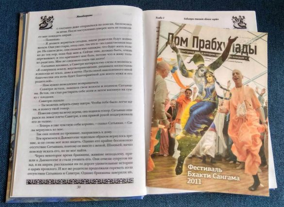 І так я гортала і розглядала сторінку за сторінкою Будинку Прабхупади і добре пам’ятаю радісних осіб відданих, які готували на кухні під час фестивалю – люди на фото здалися мені щасливими. Там же я почала читати Махабхарату, але було трохи складно розібратися в цих хитромудрих іменах, а ось ілюстрації в книзі мені дуже сподобалися. На якийсь час я забула про цю книгу, але через пару місяців зустрівши відданих у Києві, виникло відчуття трохи схоже на дежавю. Тоді я зрозуміла, що десь мені вже точно зустрічалося щось подібне і я згадала про книгу, яка чудово дісталася мені, про газету “Дім Прабхупади” і ті щасливі обличчя відданих.